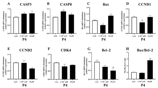 Effects of P4 on mRNA transcription abundance of apoptosis-related genes (A–C), proliferation-related genes (D–G), and Bax/Bcl–2 ratio (H) in pTr cells treated with P4 for 48 h. The results represent the average ± SEM of three independent experiments; * indicates values significantly different from that of the control group (p < 0.05); ** indicates values significantly different from that of the control group (p < 0.01).