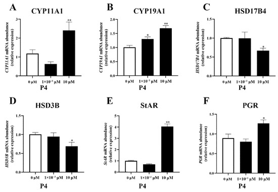 Effect of P4 on mRNA abundance of steroidogenesis−related genes CYP11A1 (A), CYP19A1 (B), HSD17B4 (C), HSD3B (D), StAR (E), and PGR (F) mRNA transcripts in pTr cells after 48 h treatment. The results represent the average ± SEM of three independent experiments; * indicates values significantly different from that of the control group (p < 0.05); ** indicates values significantly different from that of the control group (p < 0.01).