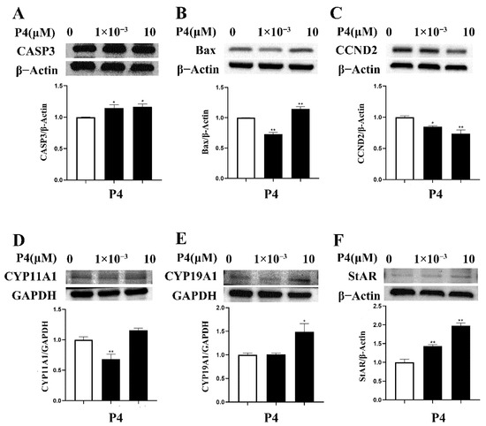 Effect of P4 on protein abundance of CASP3 (A), Bax (B), CCND2 (C), CYP11A1 (D), CYP19A1 (E), and StAR (F) in pTr cells after 48 h treatment. The results represent the average ± SEM of three independent experiments; * indicates values significantly different from that of the control group (p < 0.05); ** indicates values significantly different from that of the control group (p < 0.01). Original Western blot bands and intensity ratio are shown in Figure S1 and Table S1.