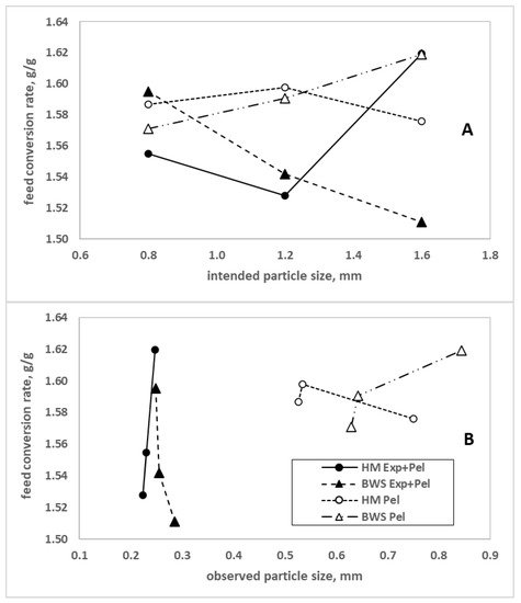 Comparison between intended and observed particle sizes. (A) Intended particle sizes are 0.8, 1.2 and 1.6 mm. (B) The particle sizes observed after sampling in the feeder, using wet-sieve analyses, representing the compound feed offered to the birds. Each line corresponds to all of the processing steps. HM: hammer mill; RM: roller mill; Exp: expander; Pel: pelleting.