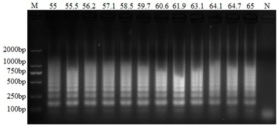 Optimal temperature of the RT-LAMP assay for PEDV. The same reaction mixtures were incubated at different temperatures (55 °C, 55.5 °C, 56.2 °C, 57.1 °C, 58.5 °C, 59.7 °C, 60.6 °C, 61.9 °C, 63.1 °C, 64.1 °C, 64.7 °C and 65 °C). The results were detected by 2% (w/v) agarose gel electrophoresis. Lane M: DL2000 DNA marker; Lane N: negative control.