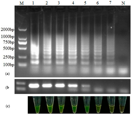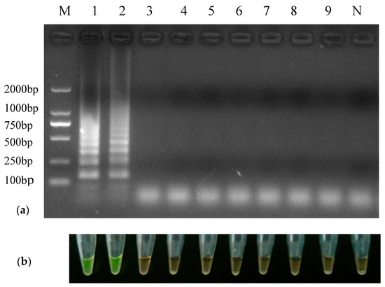 The amplification products of RT-LAMP and RT-PCR were detected by 2% (w/v) agarose electrophoresis and observed by staining with Goldview (SBS Genetech Co., Ltd., Shanghai, China). Additionally, the RT-LAMP products were visually observed according to their color by mixing each sample with 2 μL 1:10-diluted SYBR Green I (Thermo Fisher Scientific, Saint Louis, MO, USA). A positive sample will turn green while a negative sample will still remain orange.