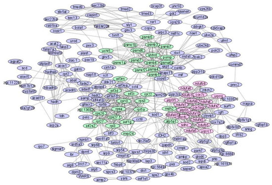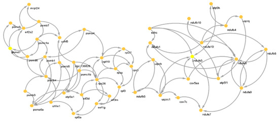 | Module 1 | ndufb10, ndufa9, uqcrb, uqcrq, ndufa6, cox7c, ndufa10, atp5h, uqcrc1, sdhc, ndufs4, ndufs1, ndufab1a, ndufs7, ndufs5, atp5f1, ndufb8, ndufb5, cox5aa, ndufa5 |