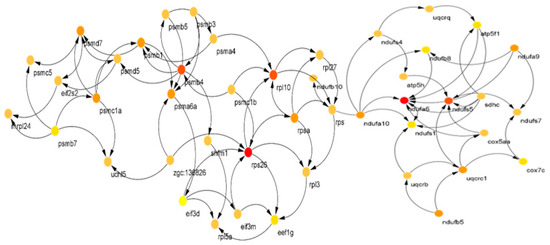 | Ribosome | 5.10 × 102 | 4.20 × 101 | mrpl24, rpl10, rpl22, rpl27, rpl3, rpl5a, rps26, rps27.1, rps3, rpsa |
