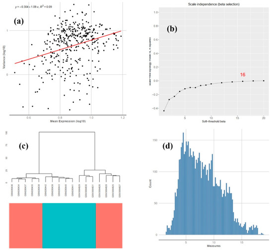 - Russo, P.S.T.; Ferreira, G.R.; Cardozo, L.E.; Bürger, M.C.; Arias-Carrasco, R.; Maruyama, S.R.; Hirata, T.D.C.; Lima, D.S.; Passos, F.M.; Fukutani, K.F.; et al. CEMiTool: A Bioconductor package for performing comprehensive modular co-expression analyses. BMC Bioinform. 2018, 19, 56. [Google Scholar] [CrossRef] [PubMed]