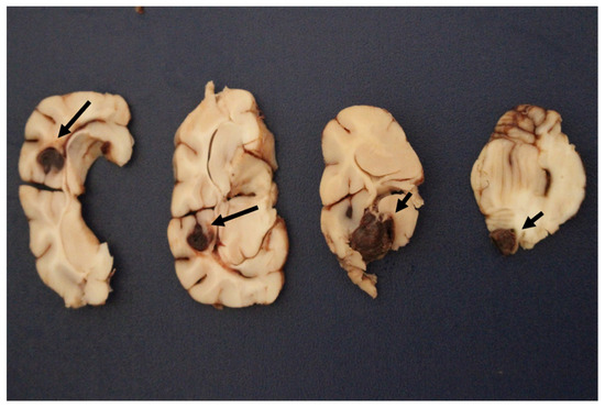 Macroscopic sections of the brain of the kitten. From left to right, hemorrhagic areas were present in the cerebral cortex, corona radiata, diencephalon, and cerebellum (arrows).