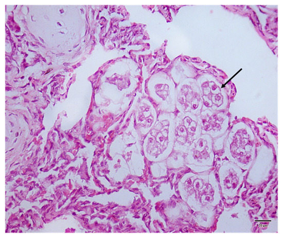 Histological section of the lung stained with hematoxylin-eosin. Parasitic eggs that fill the alveolar lumens are visible (arrow).