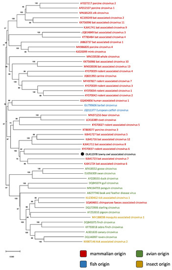Phylogenetic relationships between the tawny owl-associated circovirus (marked with a black dot) and representatives of every known species of circovirus, whose names were color-coded based on origin. The tree was inferred using the Neighbor-Joining method [27] with pairwise deletion. The percentage of replicate trees in which the associated taxa clustered together in the bootstrap test (1000 replicates) are shown next to the branches [28].