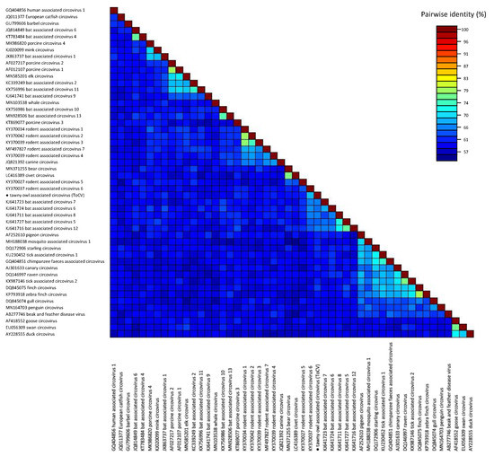 The phylogenetic relationships of the detected strain with representatives of currently recognized species of the genus Circovirus are shown in Figure 1. As revealed by the pairwise identity matrix (Figure 2), the sequenced genome showed the highest identity (69.7%) with rodent-associated circovirus 6. Therefore, according to the species demarcation threshold for the genus Circovirus, which is set at 80% genome-wide nucleotide pairwise identity [10], the detected virus belongs to a new species, which was tentatively named “tawny owl-associated circovirus” (ToCV).