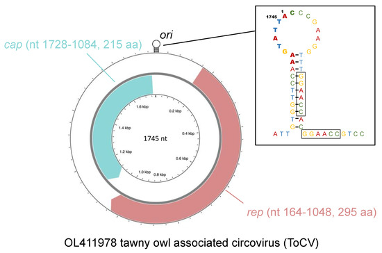 All samples but one tested negative to the PCR analysis. The positive sample was collected from the spleen of a tawny owl, while the liver sample from the same animal was negative. Based on the partial sequence amplified with the pan-Circovirus assay, another pair of primers, RC-F (5′-ACACCCACGTTCCGTAAAAC-3′) e RC-R (5′-CGAGAAGACCGAAGTCTTGG-3′), was designed, allowing for full genome sequencing. The genome, whose length was equal to 1745 nucleotides, was deposited in GenBank with accession number OL411978.