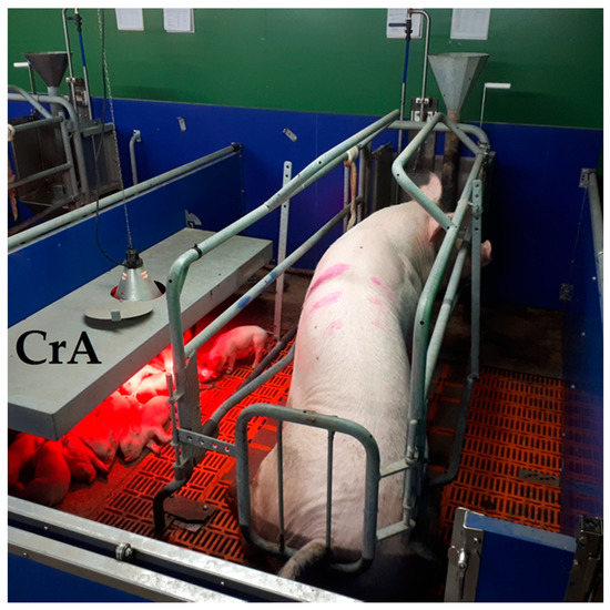 The FC pen’s dimensions were 260 cm in length and 200 cm in width (5.2 m2). The 190 cm-long and 80 cm-wide farrowing crate was located in the centre of the pen and provided a usable area of 1.52 m2 to the sow. The 150 cm-long and 60 cm-wide, three-sided open creep area for piglets was arranged parallel to the sow’s crate. The creep area was heated by a 150 W infrared lamp as well as by a heated concrete floor (Figure 1).