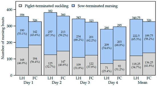 While during the first week of lactation, there was still a similar ratio of sow-terminated and piglet-terminated nursing bouts in the LH pens, more nursing bouts in the FC pens were piglet-terminated than in LH pens. Meanwhile, more nursing terminations by the sow were observed in both systems from week 2 of lactation (Figure 3).