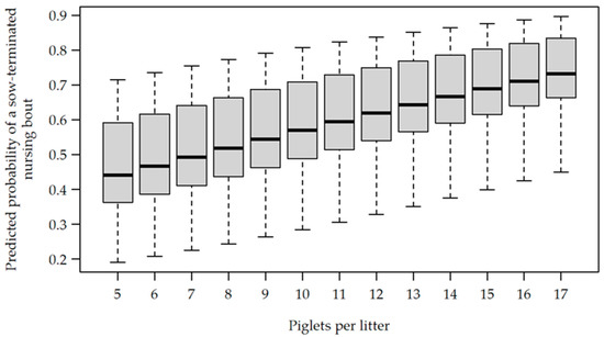 While parity did not affect the occurrence of sow-terminated nursing bouts (OR 1.089, CI [0.924, 1.283], p = 0.310), the litter size (OR 1.109, CI [1.008, 1.220], p = 0.033) and the time of day (OR 1.300, CI [1.095, 1.543], p = 0.003) were shown to have an effect. In the morning, 59.5% of the nursing bouts were sow-terminated, whereas this figure rose to 64.03% in the afternoon. In Figure 4, the results of the statistical model for the probability of sow-terminated nursing are shown for different litter sizes.