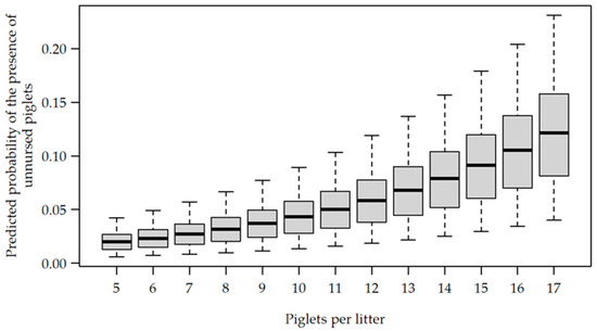 However, it was shown that when litter size increased, the probability of unnursed piglets occurring increased as well (OR 1.174, CI [1.039, 1.326], p = 0.010) (Figure 5).