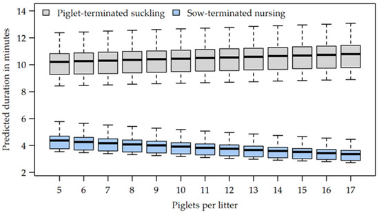 While the number of suckling piglets per litter had no influence on nursing duration per se (OR 1.005, CI [0.978, 1.032], p = 0.738), there was a significant effect of the interaction between the litter size and the occurrence of sow-termination (OR 0.974, CI [0.951, 0.998], p = 0.031). The shorter the duration of sow-terminated nursing bouts the more piglets were present in a litter. In contrast, the duration of piglet-terminated nursing bouts rose when the litter size increased (Figure 6).