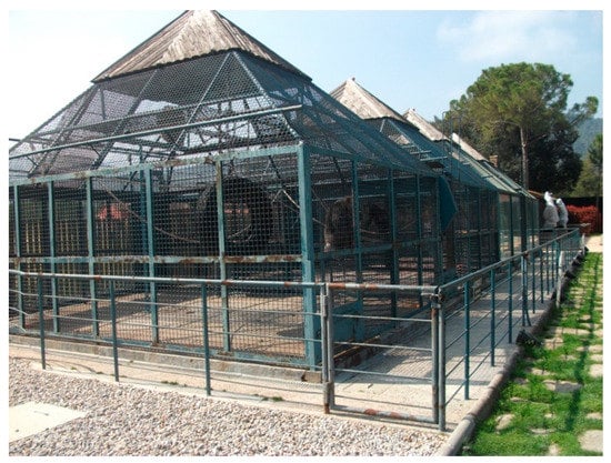 The first set of data was recorded in 2004 when the three chimpanzees were housed in adjacent outdoor cages. Each of the two cages measured 5.80 m × 4.45 m, with a height of 1.90 m. At the top of each cage, there was a 2.40 m × 1.85 m pyramidal wooden structure with a height of 1.30 m, which served as a shelter in case of bad weather conditions. It was also used to lock up the chimpanzees for maintenance work. Each pyramidal structure was equipped with a heating system (see Figure 1). The cages were furnished with climbing structures and objects such as platforms or wheels. The floor of the cages was made of concrete and there was no access to natural substrate. There were two feeders and drinkers per cage to provide sustenance. Next to the chimpanzees’ cages were other cages housing animals such as birds and other small primates. Dogs were also able to approach the chimpanzee cages. There was no management or care protocol in place. To clean the cages, the keeper used the hose to force the chimpanzees into the pyramidal structure and locked them there.