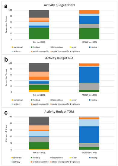 Comparison of the activity budgets while housed as pets (left) and after living at MONA for about 10 years (right) for (a) Coco, (b) Bea and (c) Tom.