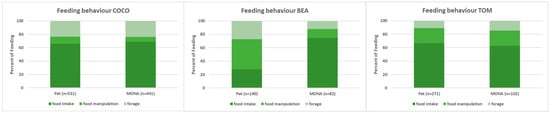 When we compared the proportion of time spent on the different subcategories of feeding behaviour—i.e., food intake, food manipulation and foraging (see Figure 3)—we found an increase in the proportion of food intake (27.9% vs. 74.4%) at the expense of food manipulation (44.7% vs. 13.4%) and foraging (27.4% vs. 12.2%) in Bea. Whereas the proportions did not change for Coco and Tom (food intake: Coco: 66.0% vs. 68.9%, Tom: 66.8% vs. 62.7%; food manipulation: Coco: 10.6% vs. 7.3%, Tom: 22.1% vs. 22.5%; forage: Coco: 23.4% vs. 23.8%, Tom: 11.1% vs. 14.7%; Figure 3).