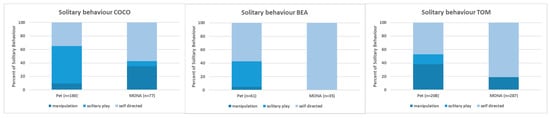 Comparison of the proportions spent on the different subcategories of solitary behaviour while housed as pets and at MONA for Coco (left), Bea (middle) and Tom (right).