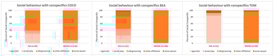 Comparison of the proportions of time spent on the different subcategories of social behaviour with conspecifics while housed as pets, and after living at MONA for about 10 years for Coco (left), Bea (middle) and Tom (right).