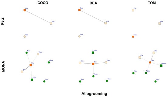 Allogrooming networks of Coco, Bea and Tom while housed as pets (upper row) and at MONA (bottom row). Edges represent percent of scans spent engaged in allogrooming (given and received); circles represent males; squares represent females. Vertex colour: orange = focal individual; peach coloured = familiar individuals; green = new conspecifics at MONA.