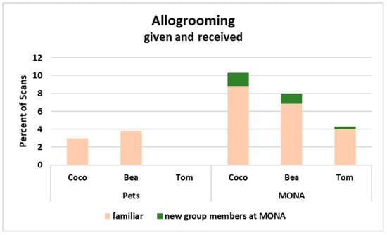 Next, we considered the distribution of allogrooming (given and received) between familiar (i.e., among the three individuals who were living together as pets before) and new (i.e., individuals met for the first time at MONA) group members. It became obvious, that all three individuals increased the percentage of time spent on allogrooming in total, however, a major part of allogrooming was still directed towards familiar conspecifics at MONA, and only very small parts were directed to two out of four new group members (Figure 7).