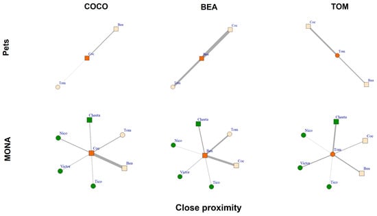 Close proximity networks of Coco, Bea and Tom while housed as pets (upper row) and at MONA (bottom row). Edges represent percent of scans spent within close proximity (i.e., within an arm’s reach); circles represent males, squares represent females. Vertex colour: orange = focal individual; peach coloured = familiar individuals; green = new conspecifics at MONA.