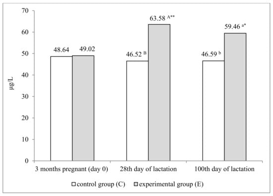 The injection of the Se preparation led to a significant increase in serum Se concentration in ewes, which was confirmed on both analytical dates during lactation (Figure 1). At the peak of lactation (day 28), serum Se concentration reached 63.58 μg/L in group E, and it was 17.06 μg/L higher than in the control group (p ≤ 0.01), whereas on day 100 of lactation, it was 12.87 μg/L higher (p ≤ 0.05). An analysis of changes in Se concentration over time revealed that it was significantly higher in group E on both analytical dates, compared with day 0 (p ≤ 0.01 and p ≤ 0.05, respectively).