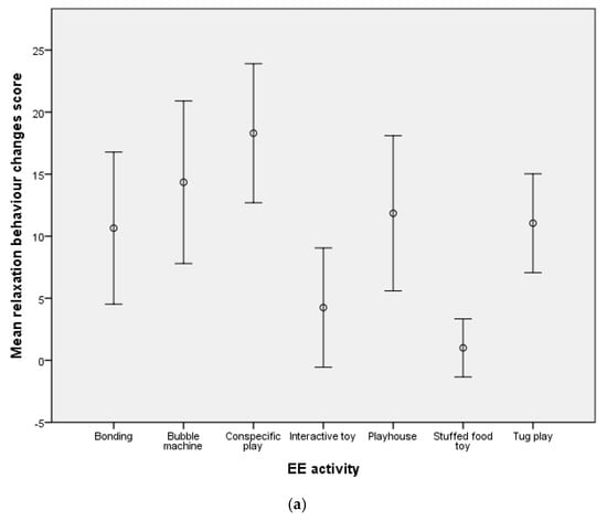 The following supporting information can be downloaded at: https://www.mdpi.com/article/10.3390/ani12020141/s1, Table S1: The behaviours coded within each behavioural category; Table S2: Mean behaviour change scores for relaxation, alert and stress behaviour for each EE activity; Table S3: Significance values for LSD post hoc pairwise analyses when comparing each EE activity to one another for alert (A), relaxation (R) and stress (S) behaviour categories.