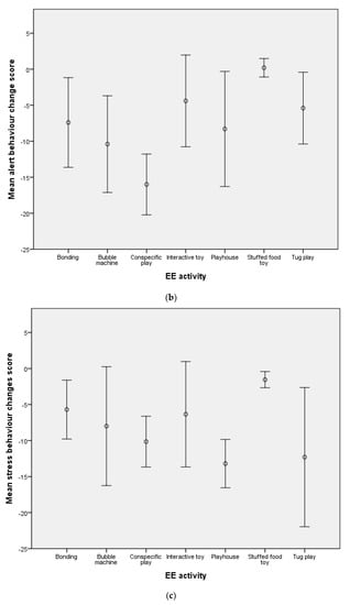 Mean behavioural change scores for (a) relaxation (b) alert and (c) stress behaviours for the seven EE activities. 95% CI bars are shown.