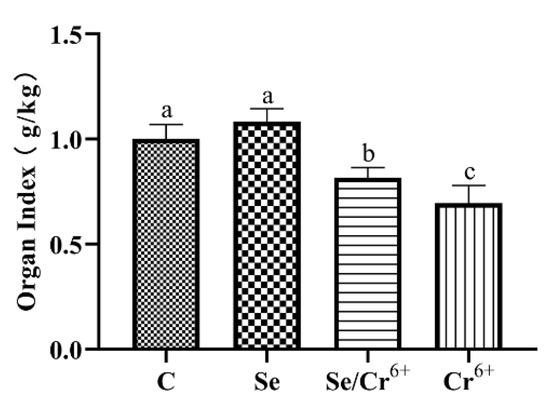 The effects of Cr6+ or/and Se on organ index in broiler chicken. Bars with different lowercase letter reflect evident differences (p < 0.05). Data are expressed as the means ± SD.