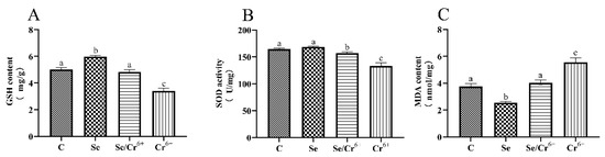 The effects of Cr6+ or/and Se on oxidative stress in broiler chicken. Bars with different lowercase letters reflect evident differences (p < 0.05). Data are expressed as the means ± SD. (A) represents the content of glutathione (GSH); (B) represents the activity of superoxide dismutase (SOD); and (C) represents the content of malondialdehyde (MDA).