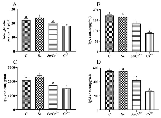 We measured whether Se could alleviate the splenic immune function caused by Cr6+ exposure by detecting the contents of T-globulin, IgA, IgG, and IgM in serum (Figure 3). Compared with the C group, the contents of T-globulin and IgG were upregulated (p < 0.05) in the Se group, and the contents of IgA and IgM in the Se group had no significant differences. Compared with the C group, the contents of all immunoglobulins and T-globulin in Se/Cr6+ and Cr6+groups were decreased (p < 0.05). However, the contents of all immunoglobulins and T-globulin in the Se/Cr6+ group were higher (p < 0.05) than that in the Cr6+ group. These results suggested that Se can alleviate the immunosuppression caused by Cr6+.
