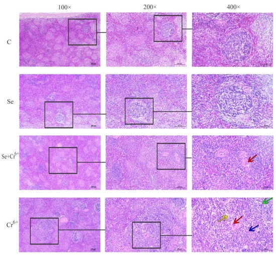 Histopathology observations of spleen tissue. The groups from top to bottom are C, Se, Se/Cr6+, and Cr6+ groups, and the magnifications from left to right are 100×, 200×, and 400×. Red arrow: aortic thickening; green arrow: inflammatory cell infiltration; yellow and blue arrows: lysis or even dissolution of lymphocyte nucleus.