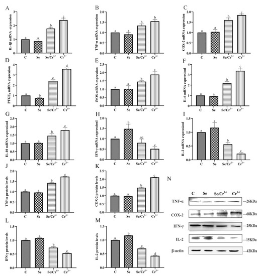 There were more TNF-α, COX-2, IFN-γ, and IL-2 proteins that were expressed detected by WB. TNF-α, COX-2, and IFN-γ proteins had no significant differences in terms of their expression levels between C and Se groups, but the expression of IL-2 in the Se group rose (p < 0.05) relative to the C group. Relative to the C group, the elevation was notable in the protein expression levels of TNF-α and COX-2 in Se/Cr6+ and Cr6+ groups, but a remarkable reduction was uncovered in the expressions of IFN-γ and IL-2 in Se/Cr6+ and Cr6+ groups. The Se/Cr6+ group demonstrated lower protein expression levels of TNF-α and COX-2 (p < 0.05) and higher expressions of IFN-γ and IL-2 (p < 0.05) than the Cr6+ group.