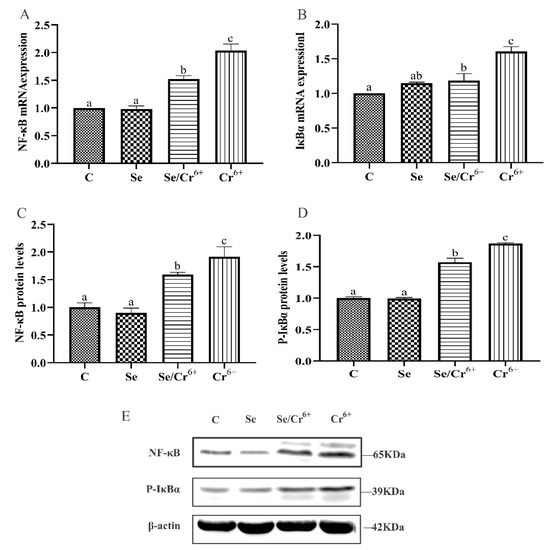 The effect of Cr6+ and/or Se on the NF-κB signaling pathway in the spleen tissue of broiler chickens. Bars with different lowercase letters reflect evident differences (p < 0.05). Data are expressed as the means ± SD. (A,B) indicate the mRNA expressions of NF-κB and IκBα; (C,D) indicate the protein expressions of NF-κB and P-IκBα; (E) indicates the depth of the electrophoresis band by Western blotting for NF-κB and P-IκBα.