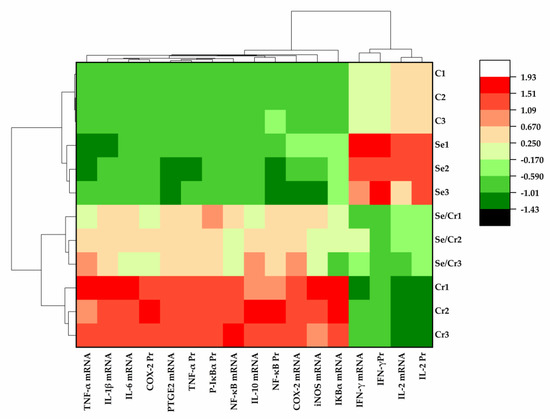 The bioinformatics clustering heat map was used to summarize the previous indicators and each sample (Figure 7). IFN-γ and IL-2 were downregulated by Cr6+ exposure, whereas the other pro-inflammatory genes were upregulated. The pro-inflammatory genes in the Se/Cr6+ group were effectively reduced compared to those in the Cr6+ group, along with the elevated expressions of IFN-γ and IL-2. Similarly, the expression of NF-κB pathway-associated genes was significantly different by Cr6+ and/or Se exposure. In addition, there was no statistical change in inflammation and NF-κB-pathway-associated genes between C and Se groups. C and Se groups were classified together, and Se/Cr6+ and Cr6+ groups were classified together. Meanwhile, compared with the Cr6+ group, the Se/Cr6+ group was closer to Se and C groups. It could be deduced that Se plays an indispensable role as a protective agent against inflammation via the NF-κB pathway in broiler spleens.