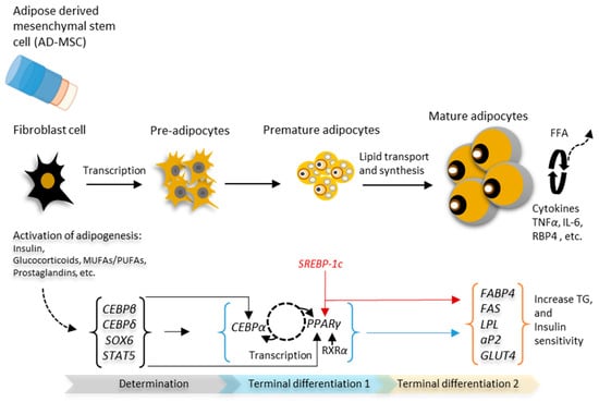 Adipogenesis is a cell differentiation process where fibroblast-like preadipocytes develop into mature adipocytes regulated by the PPARγ gene, while the process of fatty acid and triglyceride synthesis is called lipogenesis. Both processes are regulated by different adipogenic and lipogenic genes, respectively [,]. Many authors have described the mechanisms controlling growth (increase in number and size; hyperplasia and hypertrophy, respectively), adipogenesis and lipogenesis [,,,]. For a polygenic trait such as fat metabolism, during transcription and adipogenesis, transcription factors bind specifically to the promoter region of their target genes and control their expression in different metabolic pathways []. In pigs, the determination and terminal differentiation stages of adipocyte differentiation occur in the adipose tissue. Conversely, in poultry, these stages of adipogenesis occur in the liver [,]. Adipogenesis is a consequence of the interaction between PPARγ with several different co-regulators involved in the control of the differentiation of fibroblast cells. At the determination stage, increased CEBPβ and CEBPδ activates CEBPα and PPARγ. CEBPα induces PPARγ expression as well as its expression. This cycle of interaction between PPARγ and CEBPα maintains increased levels of PPARγ and CEBPα and subsequently results in the start of adipocyte differentiation []. From examined literature [,,,,], a simplified schematic representation of the process of adipose tissue development is presented in Figure 1.