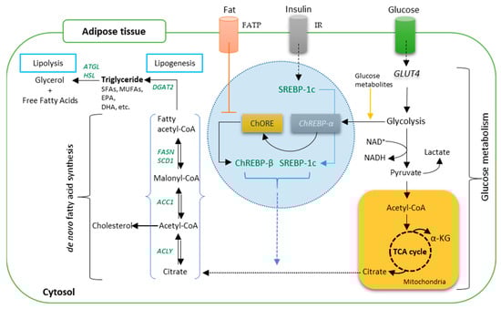 Figure 2 shows the conversion of glucose to pyruvate through the cytosol of the cell tissue and transported into the mitochondria for further oxidation in the TCA cycle to produce citrate. In response to insulin secretion, the expression of SREBP-1c is initiated for adipocyte lipogenesis. The citrate generated from the TCA cycle is then exported back into the cytosol as a substrate for de novo lipogenesis which subsequently results in the release of acetyl-CoA by ACLY. FASN then converts malonyl-CoA to palmitate which becomes elongated to produce oleic, stearic and palmitic acid. The activation of ChREBP-α by glucose metabolites (generated during glycolysis) binds to promoter regions of ACLY, ACC1, FASN, SCD1, and ChREBP-β coding genes. Fatty acid synthesis is then promoted by the ChREBP-β sequel to activation of its target genes. However, fat intake blocks the expression of ChREBP-β and suppresses de novo lipogenesis [,,].