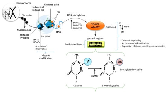Histone modification alters gene expression through mechanisms of HATs’ and HDACs’ functions during acetylation of histones at their lysine residue sites. Histone modification begins with the addition of an acetyl group (Ac) by acetyl CoA followed by HATs regulated acetylation. HDACs serve as catalysts for the hydrolytic removal of the acetyl groups from histone (Figure 3). When this mechanism is altered, mutation and disease or trait progression are observed. DNMT1, DNMT3A and DNMT3B initiate and maintain CpG methylation across the genome by either blocking or allowing binding of proteins associated with methyl-CPG-binding sites []. Such sites are genomic regions where cytosine is separated from guanine by just a phosphate group (CpG islands) in a linear sequence of a base in the direction of 5′ → 3′ [,,]. The effects of cytosine methylation within the base sequence of a gene include processes involving genomic imprinting, X-chromosome inactivation, suppression of repetitive elements, lipogenesis, and carcinogenesis []. DNMT1 has a significant regulatory effect on genes at the CpG-binding sites. Studies have shown that when it binds at CpG to the SREBP1 gene, it down-regulates the activity of SREBP1 while an unmethylated promoter exerts an opposite effect by up-regulating the activity of the SREB1 gene during adipogenesis []. Another mode of action of DNMT1 shows that it regulates adipogenesis by promoting differentiation at an early stage while inhibiting lipogenesis at the late stage of preadipocyte differentiation [].