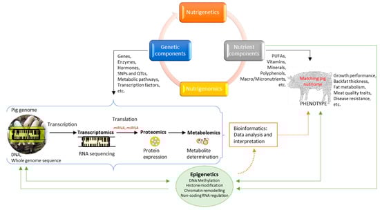 Each definition provided by the cited authors presents nutrigenetics and nutrigenomics as the science which integrates “omics” tools in providing insights into the nature of the interaction between inherited genes and nutrients in the diet. The importance of the application of nutrigenetics and nutrigenomics has since been utilized in human nutrition for understanding disease onsets and has been used to birth treatment options based on the concept of “individualized nutrition” []. In pigs, the combined effect of diets, genes, sex, age, environment, etc., on disease susceptibility, growth performance, fat metabolism and meat quality traits are starting to emerge. It could be hypothesized from Fench et al. [] that just as in humans, the existence of differences in inherited genes affects nutrient bioavailability and metabolism in pigs regardless of breed differences.
