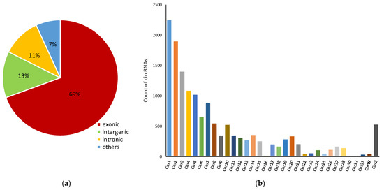 Characteristics of circRNAs. (a) Breakdown by circRNA type; (b) chromosome distribution of all identified circRNAs.