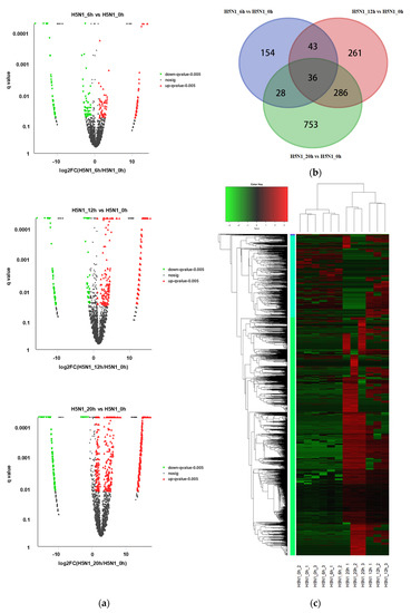 CircRNA expression changes in chicken DF1 cells infected with H5N1 avian influenza virus. (a) Volcano plot of circRNA expression. X–axis represents log2 (fold change) of circRNA expression; Y-axis represents q-value of circRNA expression changes. Red dots represent significantly upregulated circRNAs and green dots represent significantly downregulated circRNAs; (b) Venn diagram showing overlap of the differentially expressed circRNAs among timepoints; (c) hierarchical clustering heatmap of the DE circRNAs. Red represents high expression and green represents low expression. H5N1_0h, H5N1_6h, H5N1_12h, and H5N1_20h represent the uninfected group, 6-h infected group, 12-h infected group, and 20-h infected group, respectively.