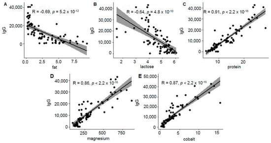 We observed a negative association between IgG and fat (r = −0.69, p ≤ 0.001, Figure 2A) and lactose (r = −0.64, p ≤ 0.001, Figure 2B) content. IgG was positively correlated with protein content (r = 0.91, p ≤ 0.001, Figure 2C). The IgG content was also correlated with magnesium (r = 0.86, p ≤ 0.001, Figure 2D) and cobalt (r = 0.87, p ≤ 0.001, Figure 2E). The correlation coefficients between IgG content and the content of other minerals were lower but significant (Table 1).