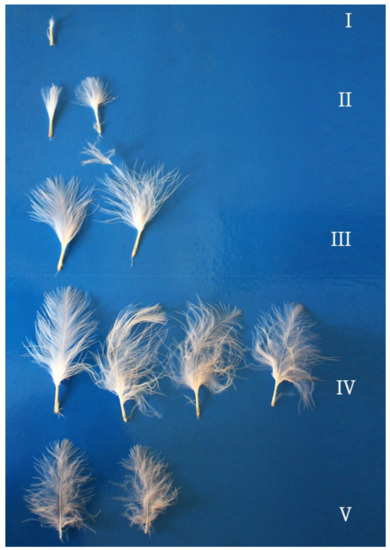Interscapular feathers in a 16-week-old turkey. Feather growth stages: I—pinfeather covered in sheath; II—barbs protruding from the sheath; III—feather unsheathed by ½ of rachis length; IV—plumulaceous (loose) vane and pennaceous (coherent) vane, feathers unsheathed by ¾ of rachis length; V—mature feathers, feather length: shortest—3.5 cm, longest—5.0 cm, afterfeathers and empty spaces between barbs.