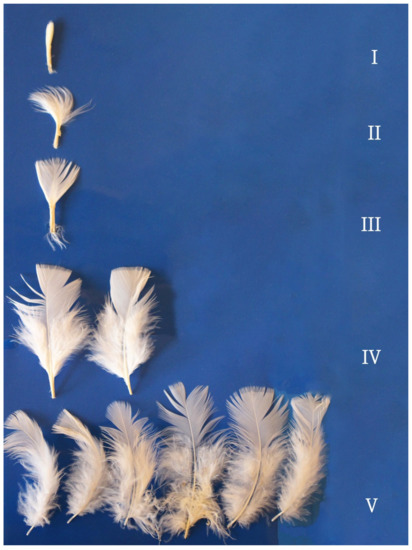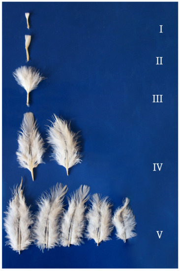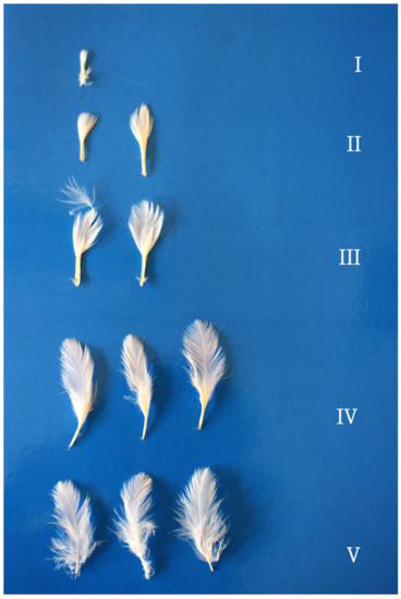 Forty-eight 4-week-old female turkeys (eight turkeys per group) and the same number of birds euthanized at 16 weeks of age were available as part of the aforementioned study by Jankowski et al. (2020a). In order to evaluate feather growth, samples of feathers were collected from the outer side of one thigh and from an area of 4 cm2 in the interscapular region, 2 cm2 on both sides of the spine. These two regions were analyzed because they are characterized by a different rate of feathering, which is fast in the interscapular region and slow in the thigh region [24,35]. A total of 192 feather-pooled samples (32 samples from each treatment) were collected. In each sample, the longest and the shortest mature feathers were measured to determine their average length. The feathers were then dried for 72 h at room temperature, and classified into five growth stages: I—pinfeathers covered in sheaths, II—beginning of vane development, III—feathers unsheathed by ½ of rachis length, IV—feathers unsheathed by ¾ of rachis length, and V—mature feathers, according to the previously presented methods [24,35]. The pattern of thigh and interscapular feathers representing different growth stages in a 4- and 16-week-old female turkeys is presented in Section 3.1. The total number of feathers collected from the dorsal and thigh regions was determined, and the percentage of feathers in each growth stage was calculated.