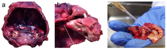The head was removed, and the inner ears were collected at the University of British Columbia (UBC) within 4.25 h post-mortem. The skull was opened with a hand saw to extract the brain, and the occipital bone was removed with a chisel T-Shape (Virchow skull breaker) post-mortem from the occipitomastoid suture (Figure 1a). The ear bones (periotic and tympanic) were separated and extracted from the squamosal bone using a chisel T-shape (Figure 1b), and the inner ears were perfused perilymphatically with 2.5% glutaraldehyde in 0.1M cacodylate buffer (Figure 1c), changed the media into 0.1M cacodylate buffer the following day, and subsequently processed for ultrastructural evaluation, following a previously optimized protocol for marine mammals [,,,].