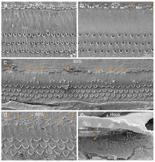 Scanning electron microscopy images of the organ of Corti of the left ear along the cochlear spiral, at 30% (a), 45% (b), 65% (c), and 80% (d) distances from the apex. Note that while the outer hair cells (OHCs) are present forming three (and sometimes four) rows, there is a loss of inner hair cells (IHCs, highlighted with orange arrows), with increasing severity towards the base. (e) First IHCs of the hook. The three first IHCs are arranged in two rows. The undersurface of the tectorial membrane shows the imprints where the stereocilia of OHCs are inserted.