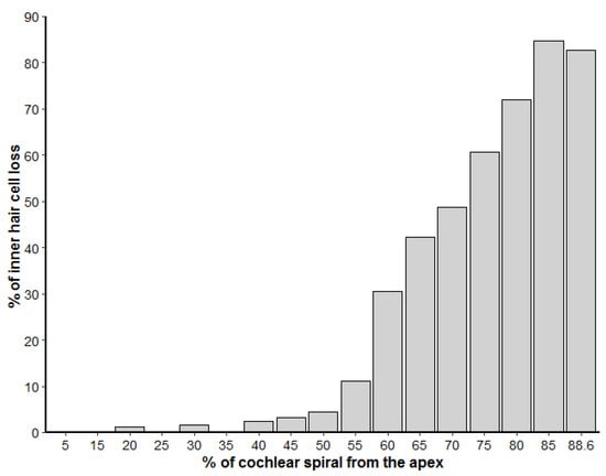 Loss of inner hair cells along the left cochlear spiral, represented in percentage from the apex. The number of inner hair cells was calculated for each 5% increment of the cochlear length.