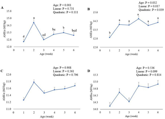 Effect of broiler age on the nitrogen-corrected apparent metabolizable energy (AMEn) for wheat (A), sorghum (B), barley (C), and corn (D); mean ± standard error. a–d Values with different superscripts differ significantly (p < 0.05).